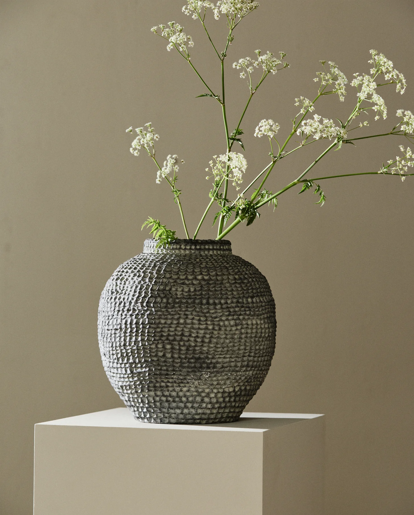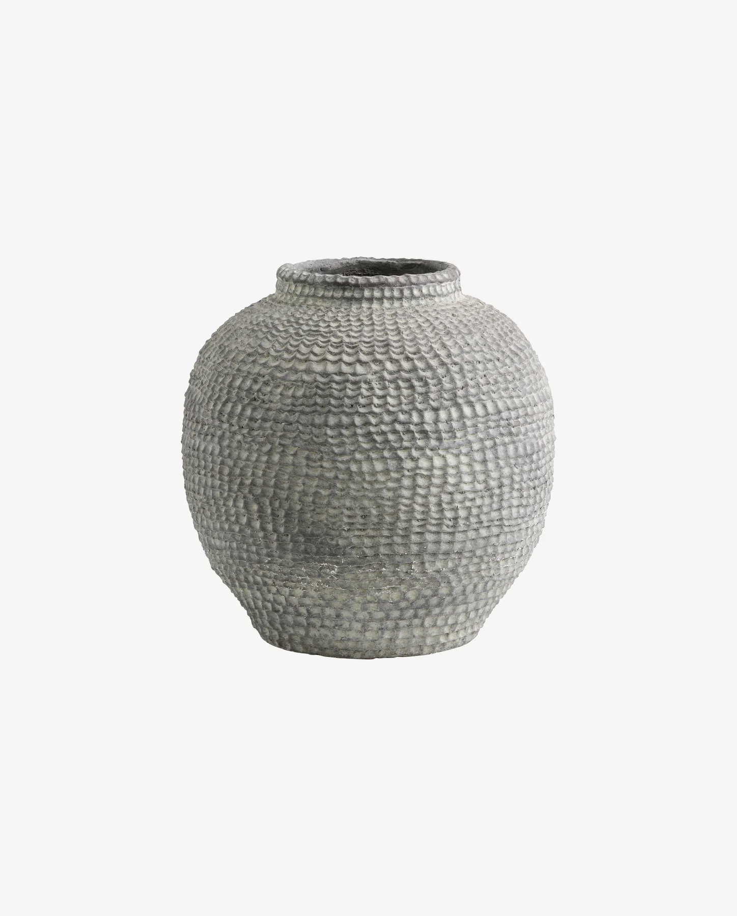 Jej okrągły, obszerny kształt i teksturowany wzór nadają jej rzeźbiarski charakter, czyniąc ją czymś więcej niż tylko donicą – to sama w sobie wyrazisty element. Można ją stylizować samodzielnie lub zestawiać z innymi materiałami, aby uzyskać kontrast i głębię.
